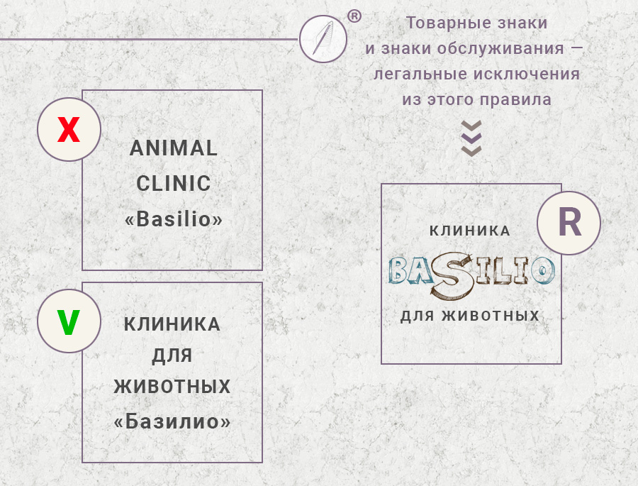 Иностранный язык можно сохранить на вывесках и прочих конструкциях, если у бизнеса есть соответствующий товарный знак. Примеры: